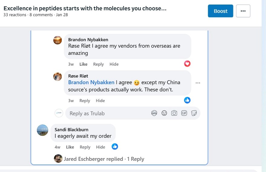 I have talked to other peptides vendors in the space, and another vendor did send her free product for traffic, to which she was unable to produce any traffic. So Rose does not have a good social media following at all. Do not send her product, she will only take and produce no results.